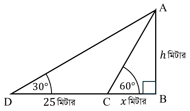 স্তম্ভের উচ্চতা $AB=h$ মিটার এবং শীর্ষের উন্নতি $\angle ACB=60^\circ$। $C$ বিন্দু থেকে $CD=25$ মিটার পিছিয়ে গেলে উন্নতি $\angle ADB=30^\circ$ হয়।