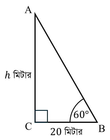 এখানে, গাছের পদদেশ $C$ থেকে $20$ মিটার দূরে ভূতলস্থ $B$ বিন্দুতে গাছের চূড়ার উন্নতি $\angle ABC=60^\circ$ এবং $BC=20$ মিটার।